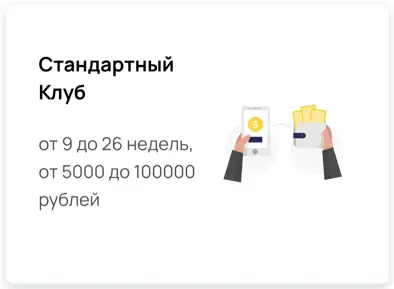 Стандартный Клуб: от 5000 до 100000 рублей, также на срок 9–26 недель, но выдаётся уже постоянным клиентам с хорошей репутацией. Проценты снижаются, лимит повышается, проверка становится проще.