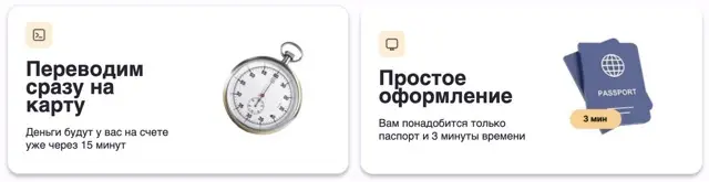 Скорость. Решение принимается быстро, деньги переводятся на карту мгновенно.