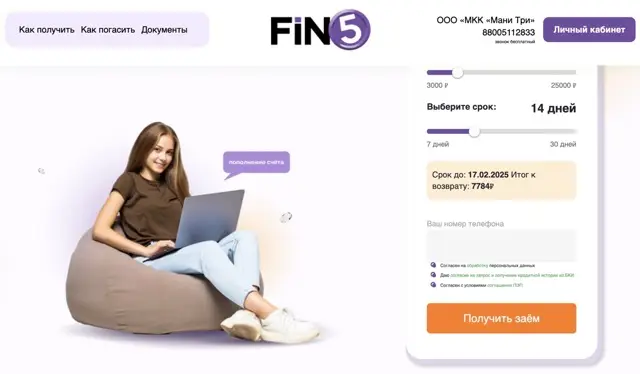 Фин5 позиционирует себя как надёжная микрокредитная компания (МФО), специализирующаяся на краткосрочных займах. Большинство клиентов ценят сервис за скорость оформления и чёткие условия: